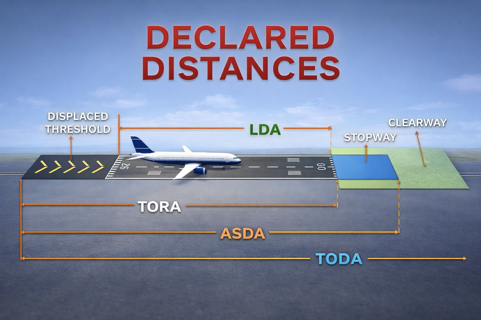 Declared distances, on the other hand, are the official, performance-relevant runway lengths published by the airport authority via the FAA Chart Supplement and other validated sources.
