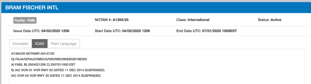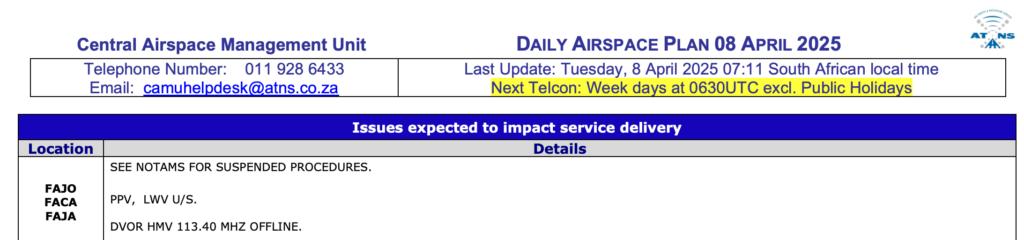 And if you’re unfamiliar with flight planning in South Africa, this can be a challenge. South Africa’s Daily Airspace Plan can provide some guidance on airports where procedures have been suspended – but it is important to consider the Notams carefully.