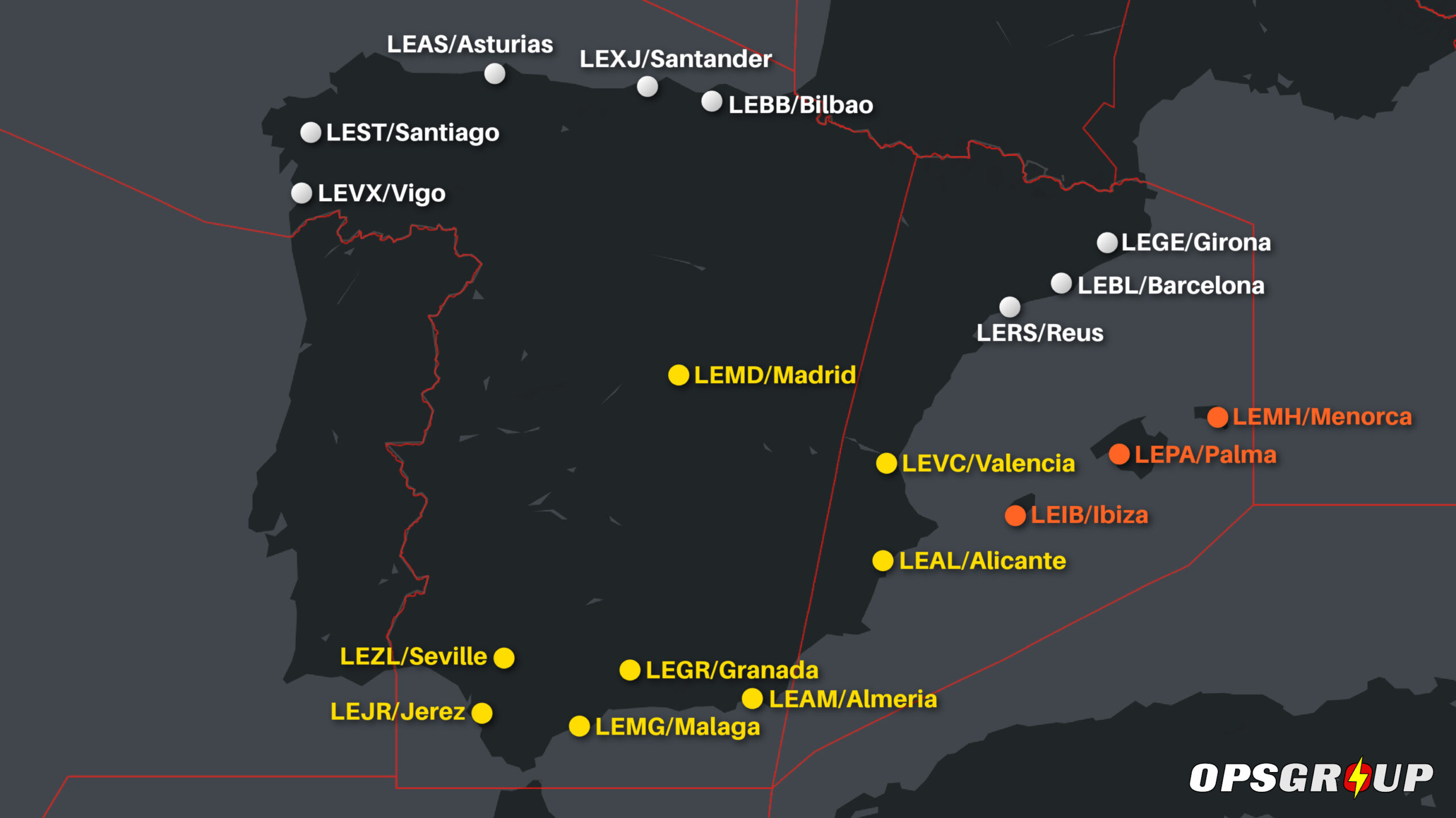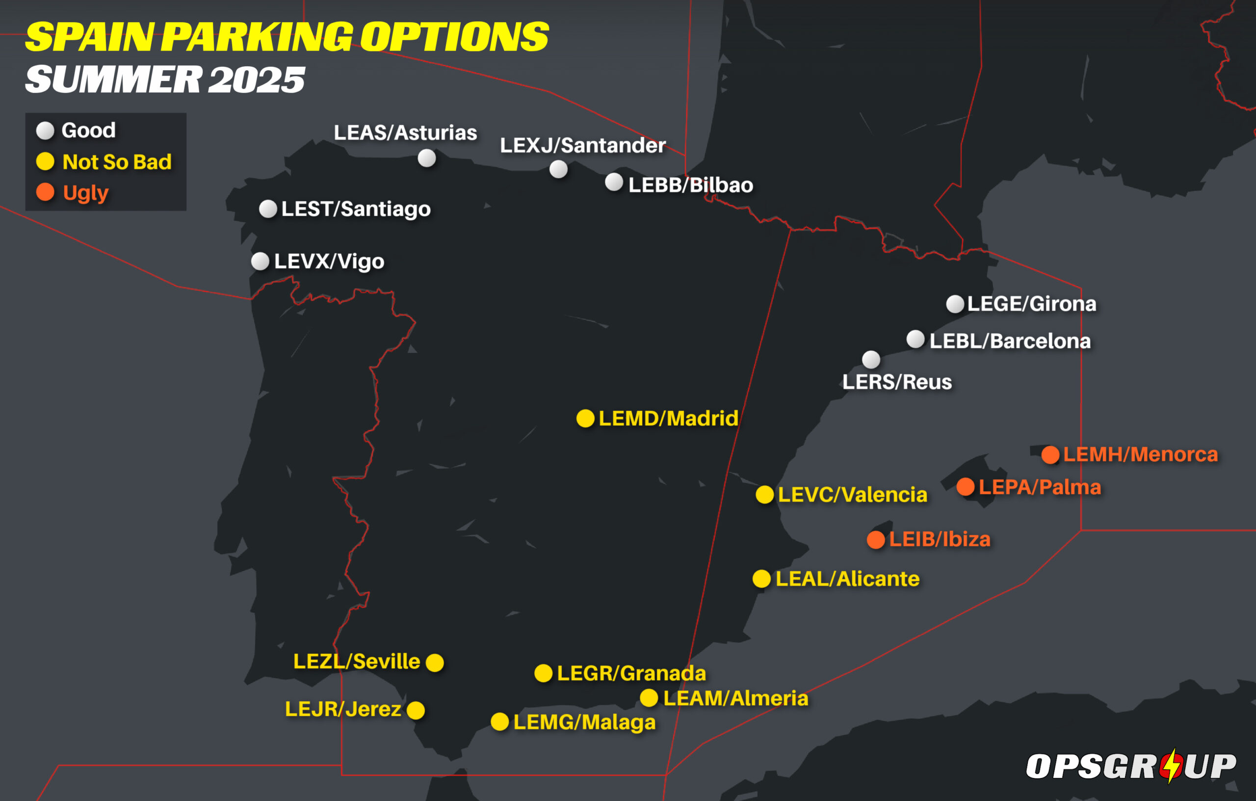 - Balearic Islands are maxed out. LEPA/Palma, LEIB/Ibiza, and LEMH/Menorca are denying overnight parking in most cases. Even short turnarounds now require formal approval.