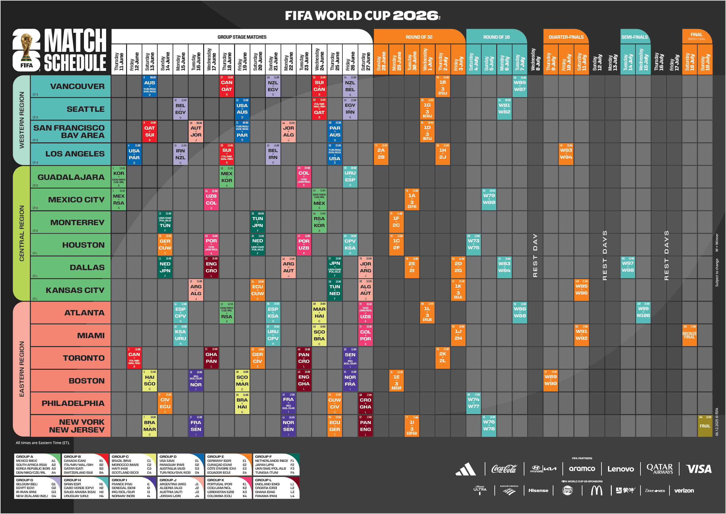 Official FIFA schedule times are published in Eastern Time (ET). Local time at some host cities is different!