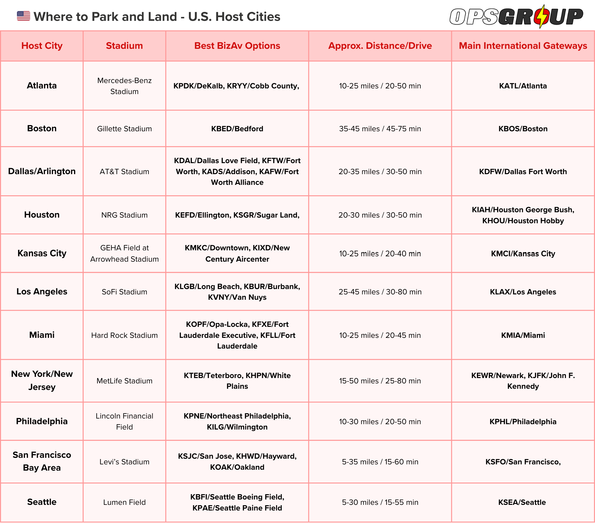 Slot controls are likely at major airports including KJFK/John F Kennedy, KEWR/Newark, KLAX/Los Angeles, KATL/Atlanta, and KMIA/Miami, particularly around key match days.